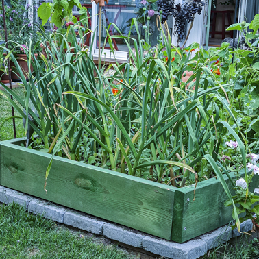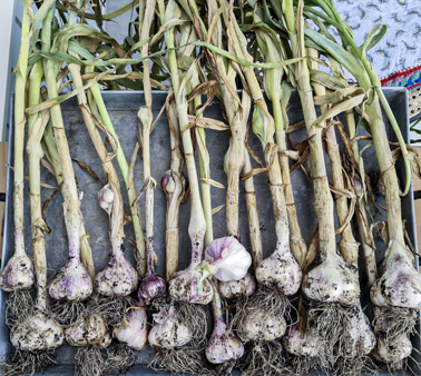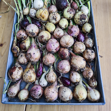 Ja, det kan man verkligen säga. All lök har jag odlat på 0,8 kvm. Vitlöken sattes i vanlig ordning i slutet av oktober i höstas. De övriga är blandad sättlök, alla utslängda på minsta möjliga utrymme. Jag har tagit en del gula lökar tidigare och någon vitlök. Resten ser du på de två brickorna. Det går fint att tränga ihop lök till max, men man måste förstås ge extra näring, hålla koll på ohyra och vattna sådana här somrar.