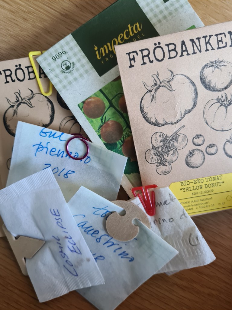 Förutom den sista i listan är de övriga höga tomater, som bör tjuvas. Av dessa höga kommer jag att välja ut nio stycken till mina tre pålar. Det är vad som ryms i den trädgård jag har nu. (Förr blev det väl 40-talet plantor i växthus och ute.) Donuten hamnar i kruka liksom en tidigare sådd ’Vilma’.