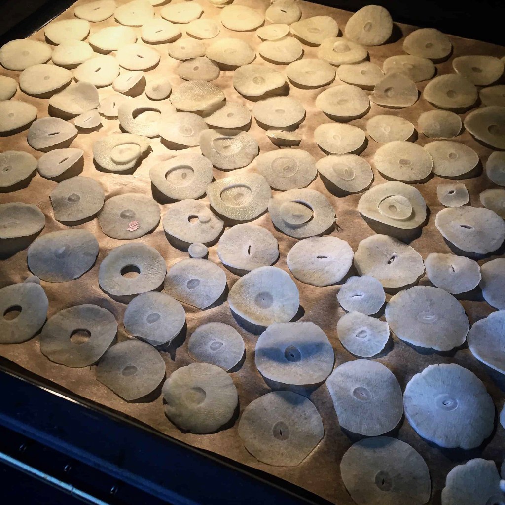 Om den gula löken är kungen i familjen så är vitlöken drottningen. Att torka vitlök till pulver går till på samma sätt som torkning av gul lök i föregående inlägg. Tunna skivor är enklast att ”mandolina” från den enklyftiga s k solovitlöken. När de är knastertorra kan du lägga dem i en burk med lock och mala lite efterhand. Jag tror att löken behåller smakskärpan bättre på så sätt. Jag har ännu aldrig haft min malda vitlök så länge att jag upplevt någon smakförsämring. Använd alltid ditt smaksinne. Smakar det inget så är det heller inget att ha.