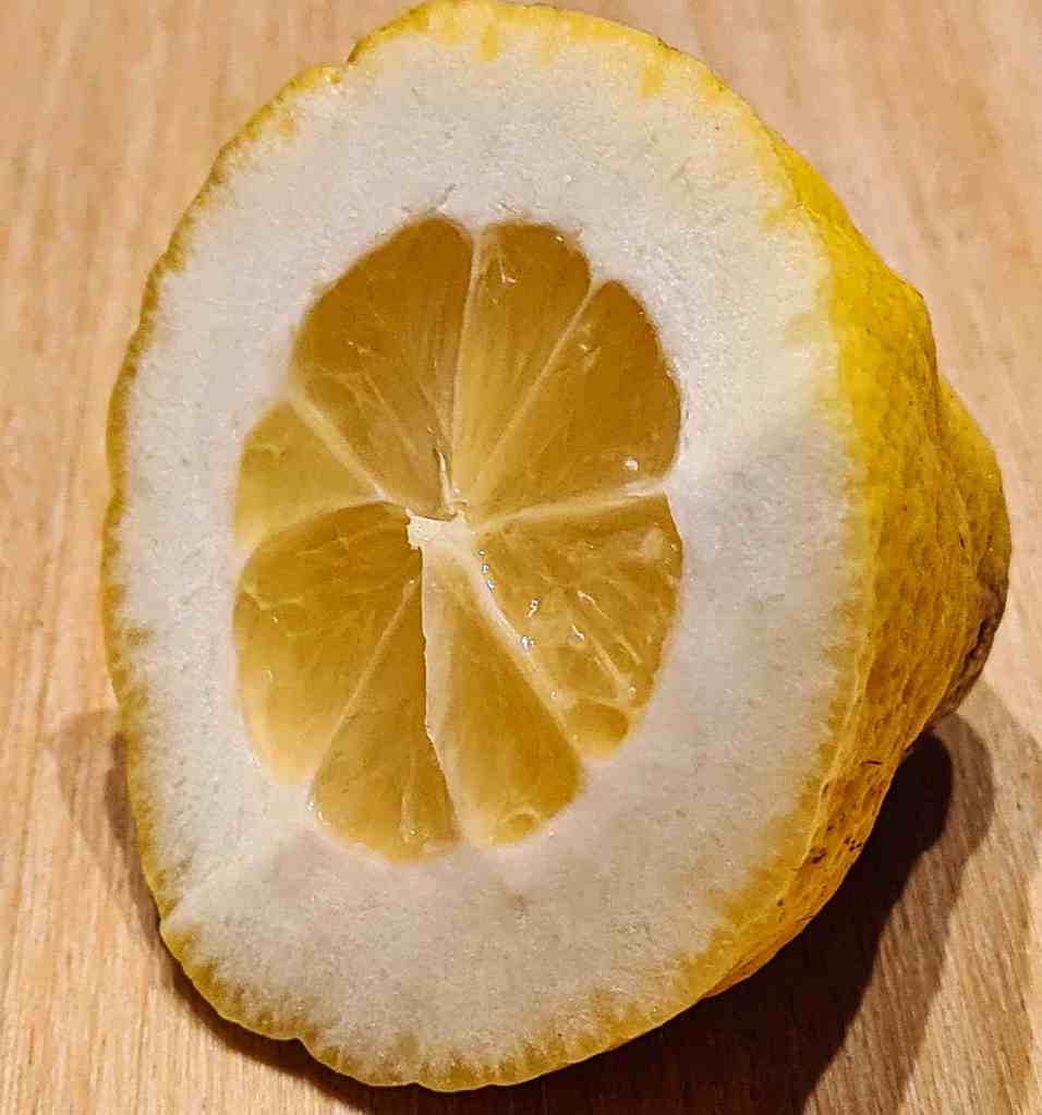 Den färska frukten kan vara svår att få tag i men just nu finns den hos Årstiderna. Kommer från Sicilien. Lite fulare än en vanlig citron men spännande.